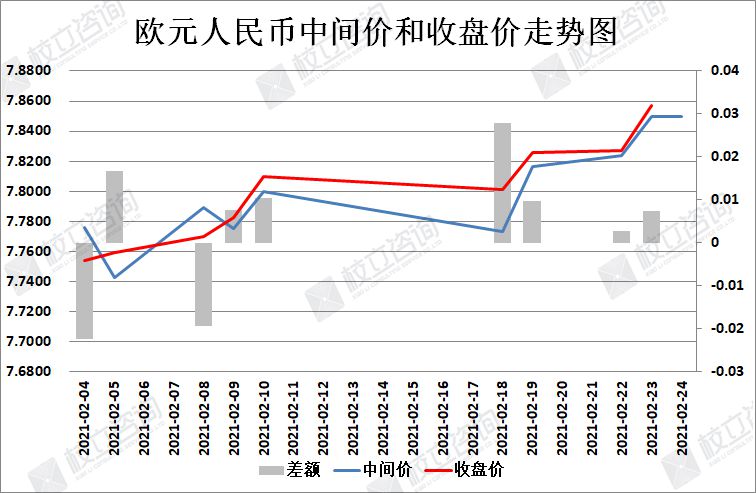 2021/2/24:欧元/人民币中间价报7.8499,中间价上调2点。中间价今天略微上调,中间价调整幅度呈现出一天大幅调整一天略微调整的规律。上个交易日收盘价高于中间价,日内波幅较小。