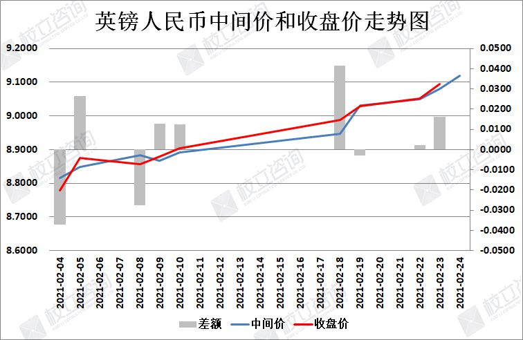 2021/2/24:英镑/人民币中间价报9.1193,中间价上调402点。中间价今日大幅上调,中间价连续六个交易日上调。上个交易日收盘价高于中间价,日内波幅较小。