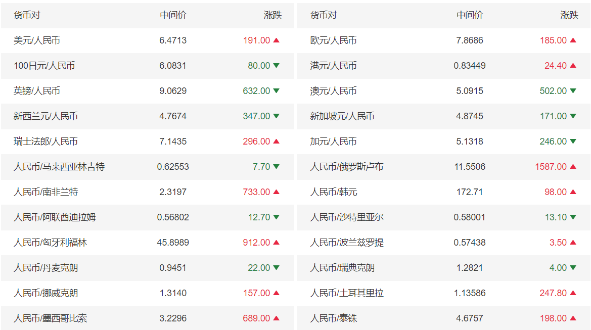 今日美元兑人民币报6.4713,上调(人民币贬值)191点;上一交易日报6.4522;