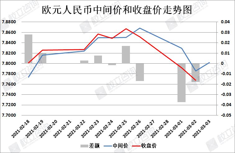 2021/3/3:欧元/人民币中间价报7.8016,中间价上调160点。中间价今天小幅上调,中间价调整幅开始扩大。上个交易日收盘价低于中间价,日内波幅较大。