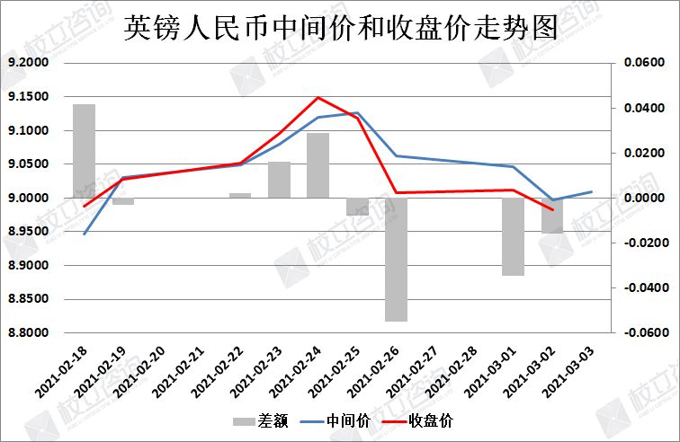 2021/3/3:英镑/人民币中间价报9.0085,中间价上调109点。中间价今日小幅下调,中间价近期处于整数关口附近。上个交易日收盘价低于中间价,日内波幅较大。