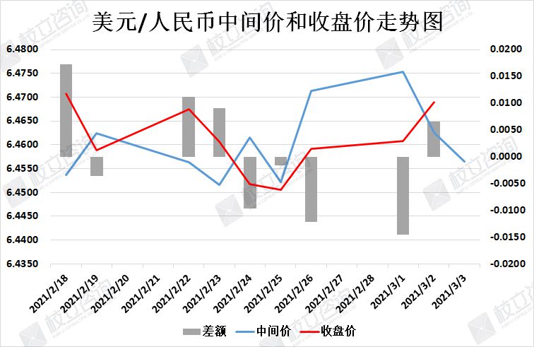2021/3/3:美元/人民币中间价报6.4565,中间价下调60点。中间价今日略微下调,中间价整体调整幅度依然较小。上个交易日收盘价高于中间价,日内波幅波幅较小。