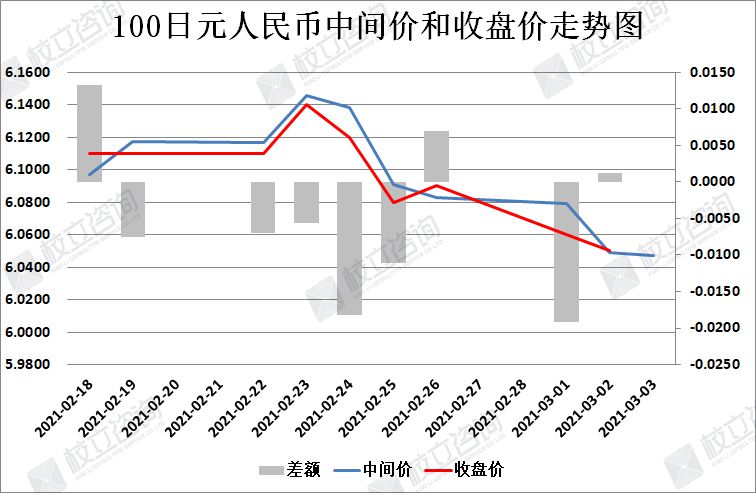 2021/3/3:100日元/人民币中间价报6.0469,中间价下调19点。中间价今天略微下调,中间价调整幅度再次收窄。上个交易日收盘价高于中间价,日内波幅较小。