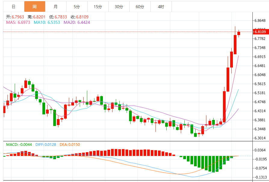 美元/离岸人民币有机会进一步推高至6.8000。昨天(5月12日),美元上涨并突破6.8000,达到6.8310的高点。动能的增加可能会导致美元进一步走强看向6.8500。在下行路上,如果跌破6.7650(之前的'强力支撑'为6.7100),将表明当前的美元涨势准备休息一下。