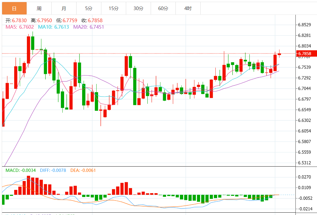 另外若美元/离岸人民币若出现回落,将指向21日均线6.7450附近,然后测试短线支撑 6.7250 水平。如果美元/离岸人民币跌破 6.7250,则不能排除汇价将进一步下跌,接近6 月低点6.6168。