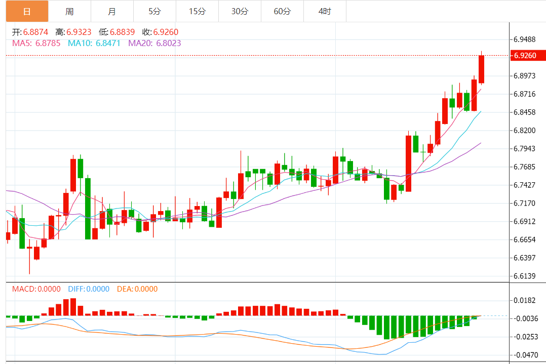 技术上,短期上行势头的迅速丧失降低了美元兑离岸人民币进一步上涨至6.9000的可能性。只有突破6.8330才表明美元兑离岸人民币走强已经结束。美元兑离岸人民币没有突破6.8330,今天,它大幅突破了6.9000。