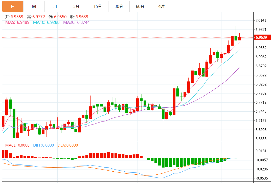技术上,尽管美元兑离岸人民币后大幅上涨,但在从6.9967大幅回落时并没有突破7.00大关。在仍然超买的情况下的回落表明美元兑离岸人民币不太可能进一步走强。今天,美元兑离岸人民币有可能在6.9450和6.9850之间盘整。