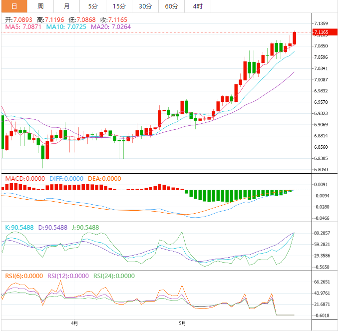或者,从5月10日开始向上倾斜的趋势线增加了7.0790支撑位的强度,突破该支撑位确认了上升的楔形看跌形态,表明理论目标位在6.9600左右。