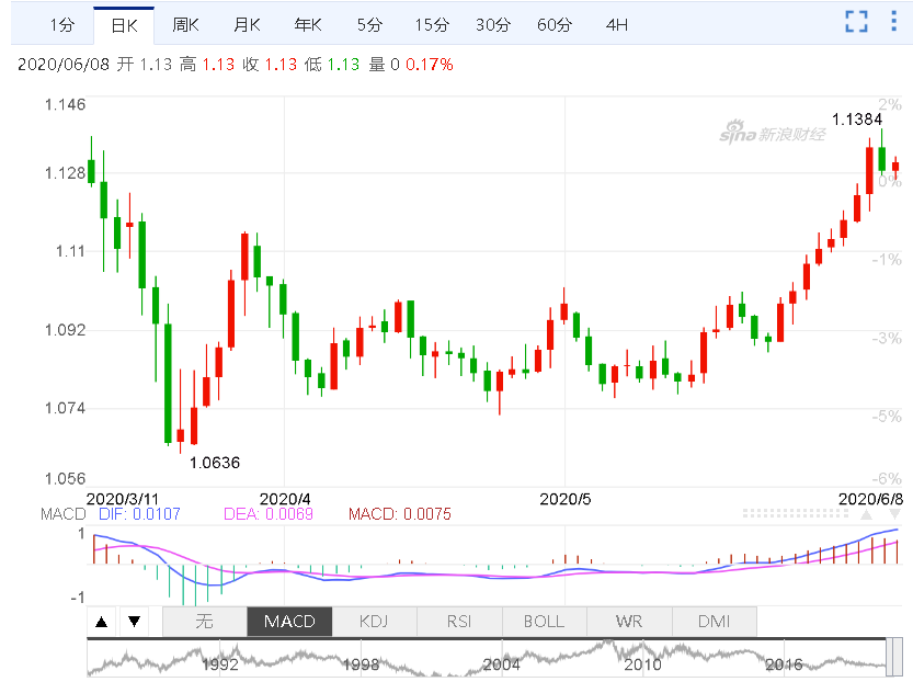 周一(6月8日)欧市盘中,欧元/美元小幅下滑,最低跌至1.1270。