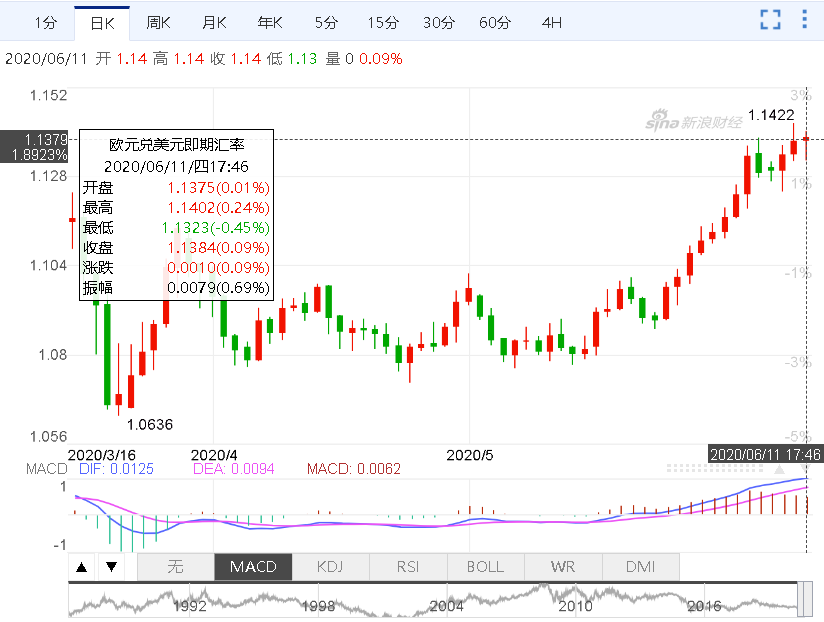 截止17:49,欧元兑美元上涨,现报1.1384。