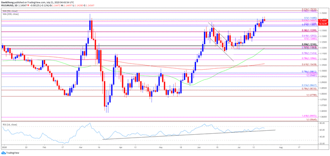 即使今日欧盟各国领导人已接近就新冠复苏基金达成协议,欧元/美元仍未能守住日内创出的月度新高点1.1470,出现回调。但相对强弱指数(RSI)正接近超买区间,显示看涨势头正在加速。