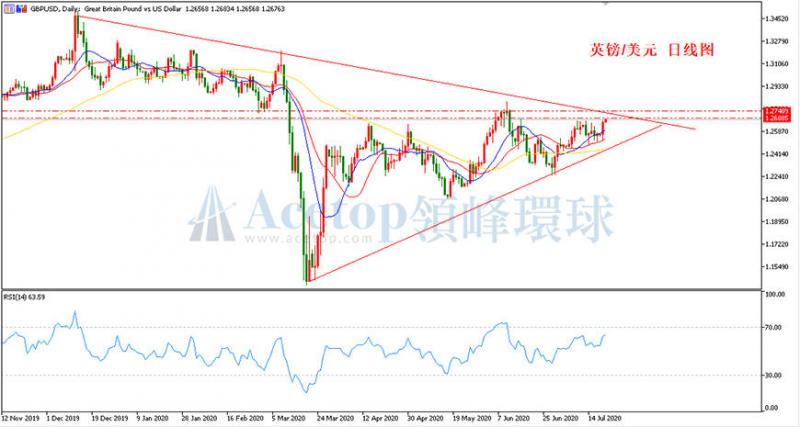 如上图所示,纵观日线图投资者不难发现当前镑美正处在收敛三角形的末端,如此大的周期中一旦后期选择方向,必定出现大的爆发式行情,对于本月下旬或八月上旬,镑美必定是汇市中最值得关注的品种之一。技术走势上,镑美自4小时周期的诱多开始目前已达前期高,若要进一步上涨,镑美需突破1.2741,从目前走势判断,突破的可能性较小。故而,建议投资者在1.2680以上寻找机会布局空单。参考阻力1.2688、1.2715;参考支撑1.2630、1.2600。
