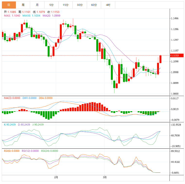 3、欧元/美元交投于上升三角形形态附近,该水平处在 3 月2 日高点1.1143 附近。然而,连接月低点1.0806 至3 月28 日低点1.0945 的通道构成上行趋势通道。