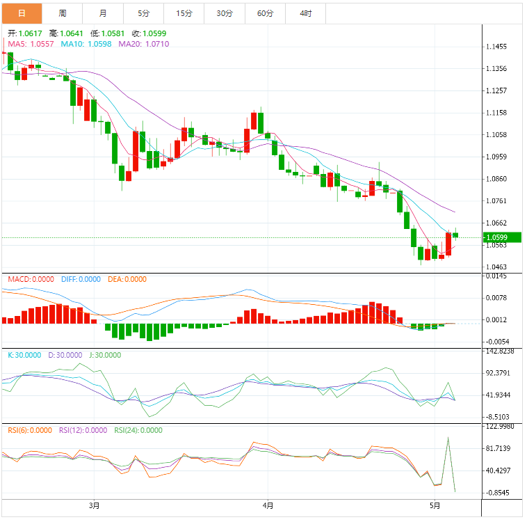 1、欧元兑美元短期上行依然受阻于4月27日高点1.0654下方附近。若突破该位,汇价将进一步反弹指向看跌的21日MA均线1.0725。不过在此之前,汇价将挑战1.0700。