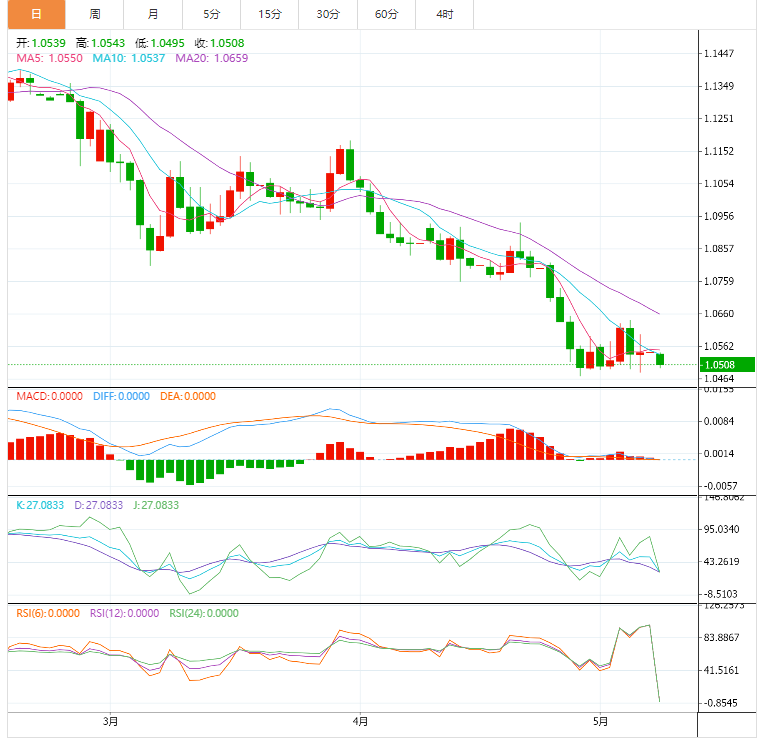 2、研究机构Sentix周一发布的最新数据显示,欧元区投资者情绪在2022年第5个月大幅下挫。Sentix投资者信心指数从4月的负18跌至负22.6,预期为负20.8。随着衰退迹象越来越明显,该指数跌至2020年6月以来的最低水平。该指数连续第三个月下跌。欧元对令人失望的欧元区Sentix数据几乎没有反应。欧元兑美元当天下跌了0.38%,目前交易价格为1.0511。