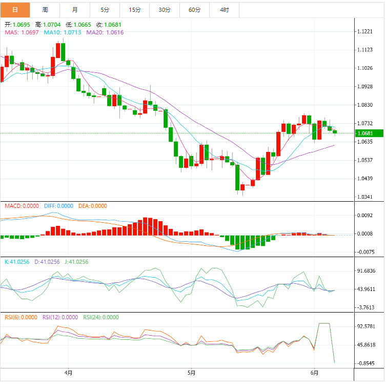3、4月下旬以来的下降倾向阻力线以及欧元/美元数度未突破50日均线,支撑空头。同样令空头维持期待的是汇价近期跌破5月13日以来上行倾向支撑,目前该水平构成阻力处在1.0710附近。此外,MACD柱状图看涨柱状收窄也加大看跌倾向。