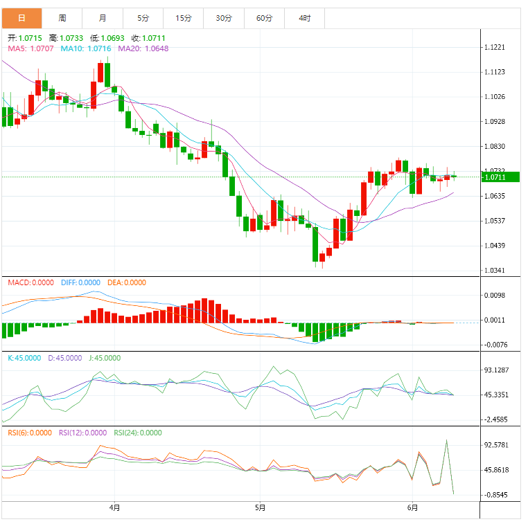 3、欧元跌至1.0650,然后反弹收盘于1.0699 (0.05%),波动不大。欧元/美元下行压力有所缓解,今日欧元可能横盘整理,预计将整理于 1.0665/1.0725 区间。