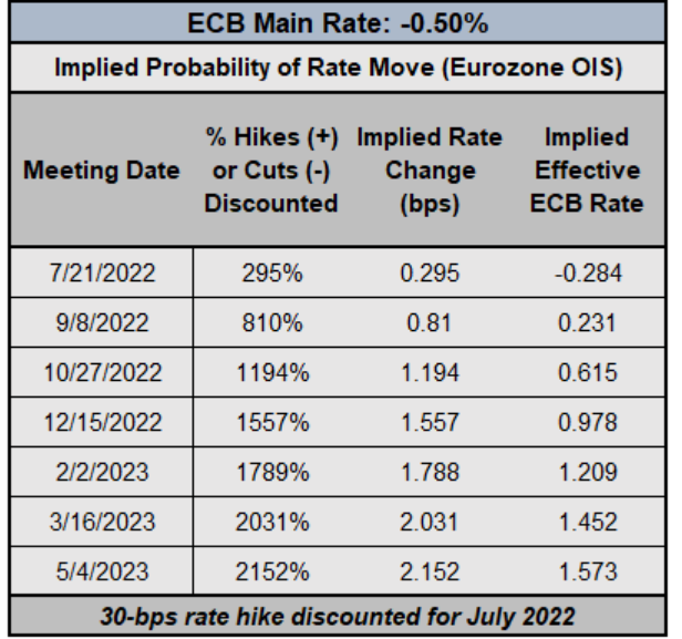 欧元区 OIS 目前预计 7 月加息 30 个基点(加息 10 个基点的可能性为 295%),这与大多数欧洲央行决策者最近几周的建议一致。取代 EONIA 的欧元 STR 现在定价到 2022 年底再上调 156 个基点,高于 4 月底的 60 个基点。欧洲央行与其他主要央行之间的预期差距继续缩小,这应有助于使欧元免受更大的下行影响(只要加息定价保持高位)。