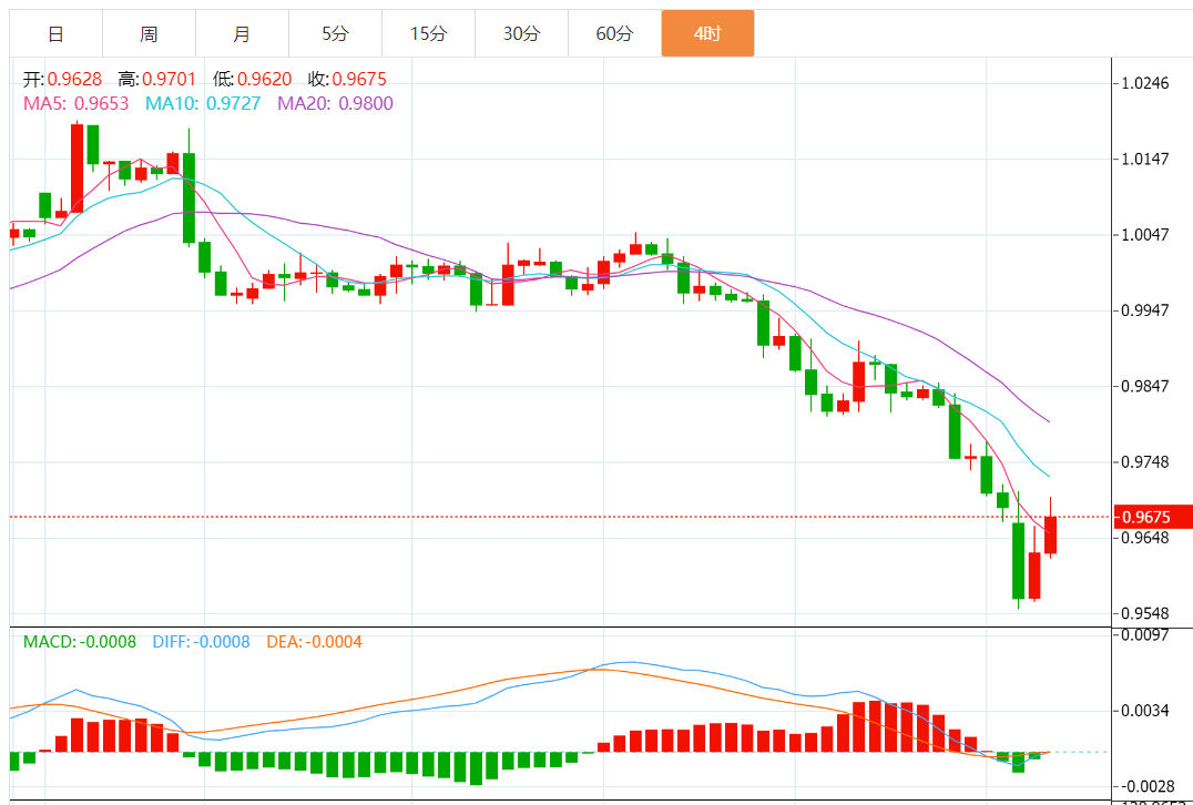 四小时图显示,过去几周欧元/美元价格一直处于强烈看跌趋势。它跌至标准枢轴点的第三个支撑位。该货币对已跌破所有移动平均线,而 MACD 已跌破中性水平。它也跌破重要支撑位0.9863。因此,随着焦点转移到标准枢轴点的第四个支撑位,该货币对可能会继续下跌。因此,随着卖家瞄准关键支撑位0.9500,它将继续下跌。