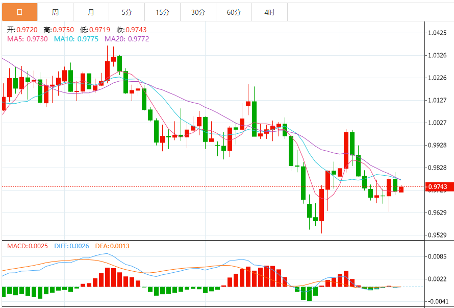 技术上,日线形态符合周线看跌倾向。到目前为止,开盘后由于阻力和价格仍遇阻上周五和上周高位,因此M形态颈线位仍构成阻力。若汇价再度测试并遇阻前期跌势的50%均值回归水平0.9815附近,可能导致汇价未来几天延续下跌。若汇价突破上週低点,很可能会接近熊市周期低点0.9535,然后是0.9400水平。