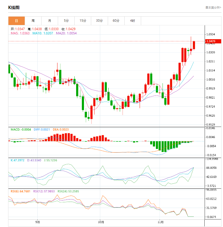 周三盘中,截止目前,欧元/美元货币对1.0430/1.0430,上升至0.0081,增幅0.79%。欧元区金融稳定风险上升,银行可能需要增加拨备。11月16日,欧元兑美元一度升至7月1日以来的最高水平1.0479,最后收涨0.21%,报1.0347。丹麦央行表示,不排除欧元兑美元进一步上涨至1.10的可能性,但前提是风险偏好保持不变。