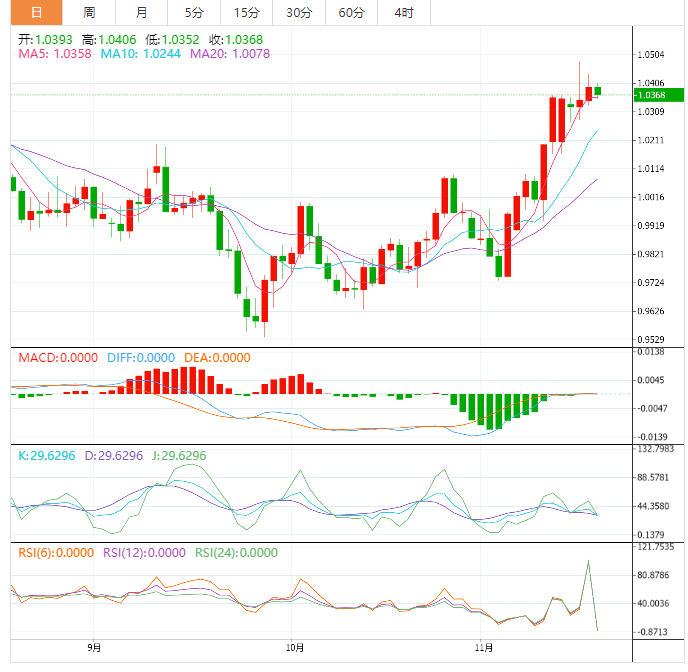 到目前为止,欧元兑美元在1.0364处下跌了0.28%,如果突破1.0024(100日移动平均线),目标位将是0.9925(11月10日的最低价),然后将走向0.9730(11月3日的月最低价)。
