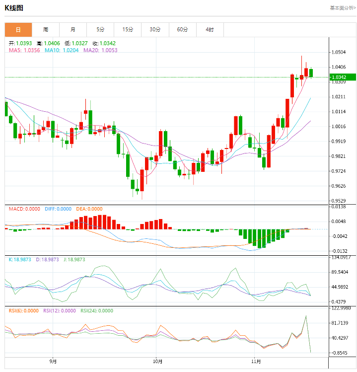 周四盘中,截止目前,欧元/美元货币对1.0346/1.0345,下跌至0.0048,跌幅0.46%。欧系货币相对坚挺,欧元小幅收涨,但未能再创新高。 欧盟预计,今年四季度和明年一季度欧元区经济将陷入萎缩。 欧洲央行管委穆勒支持12月大幅加息,希望能在12月就量化紧缩计划达成协议。美国10月零售销售月率录得1.3%,为2022年2月以来最大增幅。数据令美联储转鸽的希望消退。高盛上调美联储终端利率预期至5%-5.25%区间。