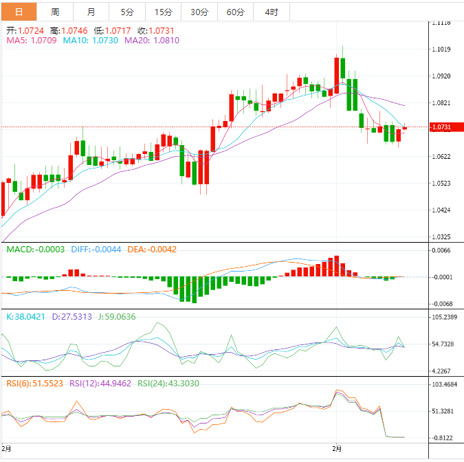 欧元基本面:欧元/美元刷新日线高位1.0730附近,并徘徊于该水平附近。美国通胀公佈前,美元指数正挣扎于维持上涨,预期欧元/美元将延续上涨势头。美元指数已经跌破103.00,投资者忽略通胀上升风险,预计美元指数将继续回落。欧元区方面,投资者正在等待第四季度国内生产总值(GDP)初值。预期是欧元区经济终于会实现与前值差别不大的增长。与此同时,欧盟委员会(EC)季度报告显示,通胀预期有所下降,对欧元区经济增长的预期有所上调,并称劳动力市场和消费者支出维持弹性。