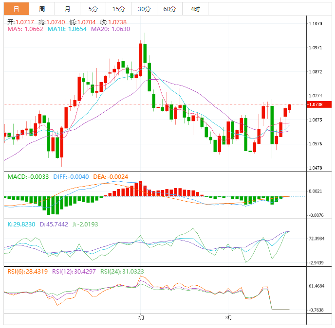 到目前为止,欧元兑美元在1.0736处上涨了0.18%,突破1.0759(3月15日的月度最高价)将成为1.0804(2月14日的周最高价)的目标位,然后是1.1032(2月2日的2023年最高价)。