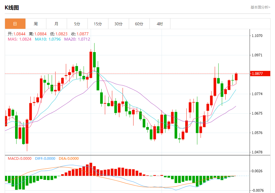 今日周四,截止目前欧元兑美元报1.0877,上涨0.31%。