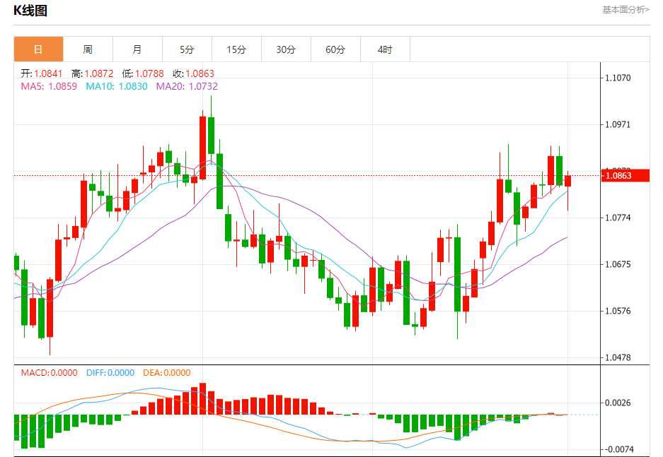 周一欧市盘中,欧元兑美元交投于1.0866,涨幅为0.21%。