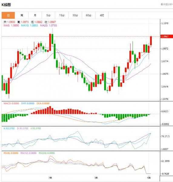 北美时段,欧元/美元交投于1.0967,涨幅0.66%。