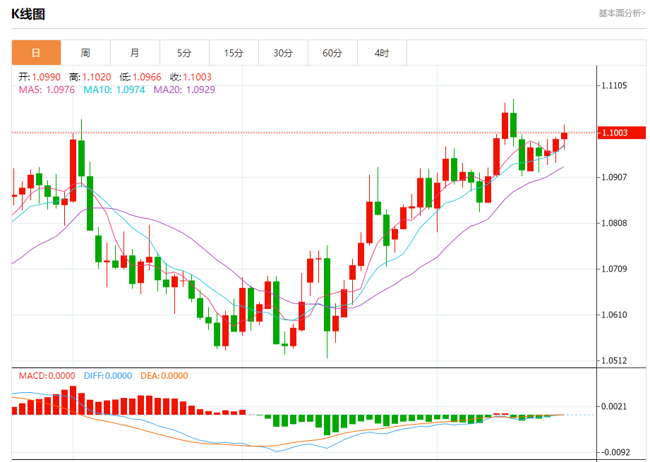 今日周一,截止目前欧元兑美元报1.1005,上涨0.12%。