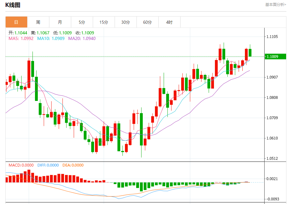 周二欧市盘中,欧元兑美元交投于1.1016,跌幅为0.27%。