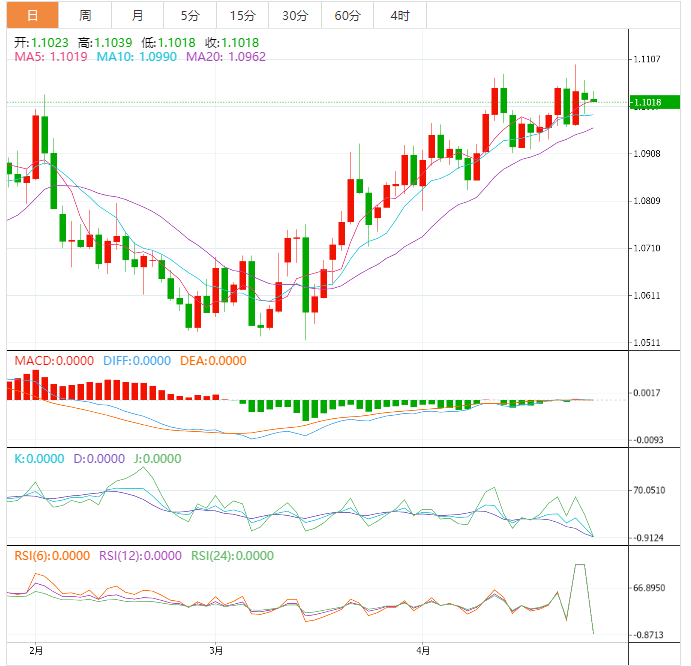 20期指数移动平均线(EMA)位于1.1030,与该资产重叠,表明该资产将出现横盘走势。