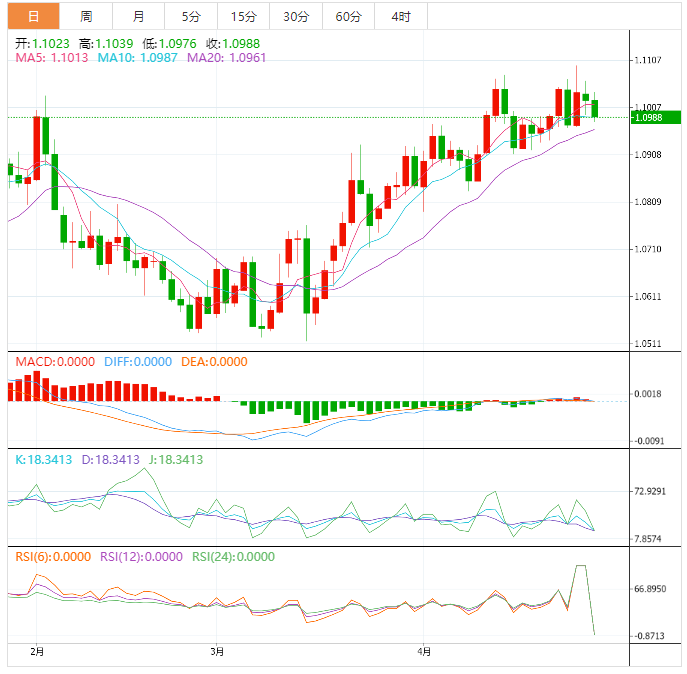 到目前为止,欧元兑美元在1.0981处下跌了0.41%,并面临下一个支撑位1.0909(4月17日的周最低价),其次是1.0831(4月10日的月最低价),最后是1.0788(4月3日的月最低价)。