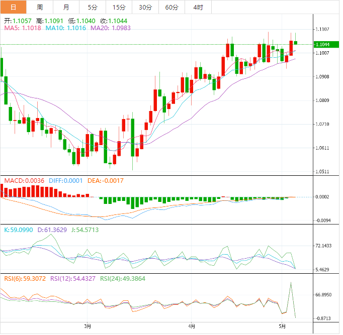 到目前为止,欧元/美元下跌0.05%,至1.1054,下方初步支撑位于1.0941(5月2日低点),其次是1.0909(4月17日低点),最后是1.0831(4月10日低点)。