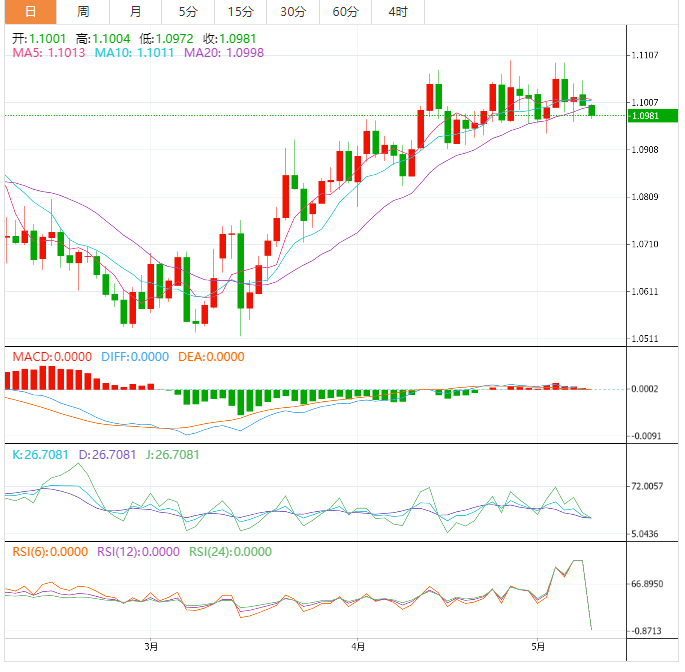 到目前为止,欧元兑美元已经下跌了0.23%,达到1.0977,并面临下一个竞争水平1.0941(5月2日的月最低价),接着是1.0909(4月17日的周最低价),最后是1.0831(4月10日的月最低价)。