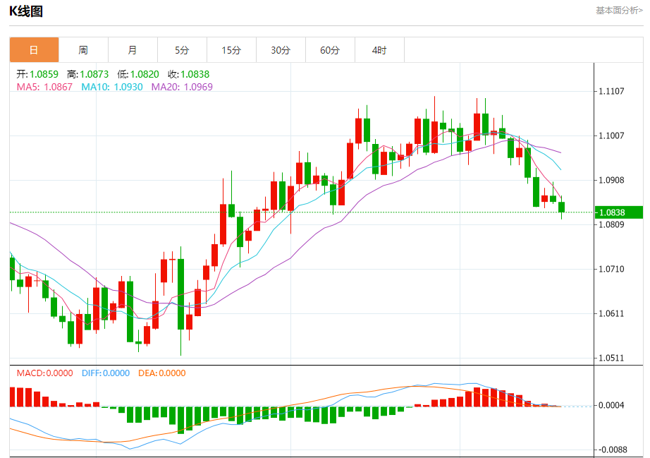 周三欧市盘中,欧元兑美元交投于1.0838,跌幅为0.21%。