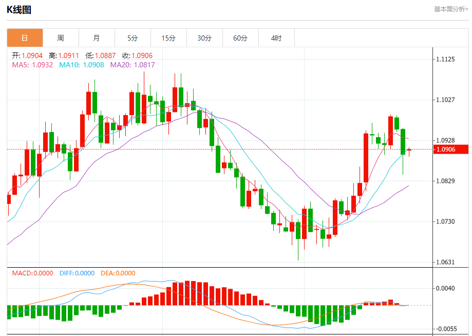 周一欧市盘中,欧元兑美元交投于1.0905,涨幅为0.09%。