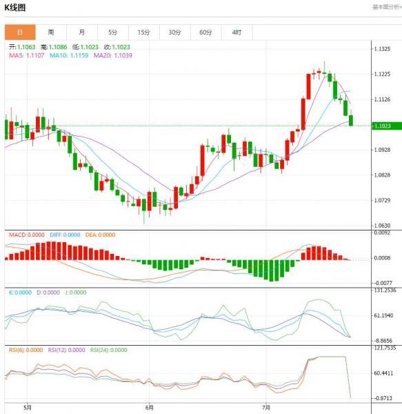 欧元周二继续下跌并处于负值区域。欧洲时段,欧元/美元报1.1036,下跌0.26%。