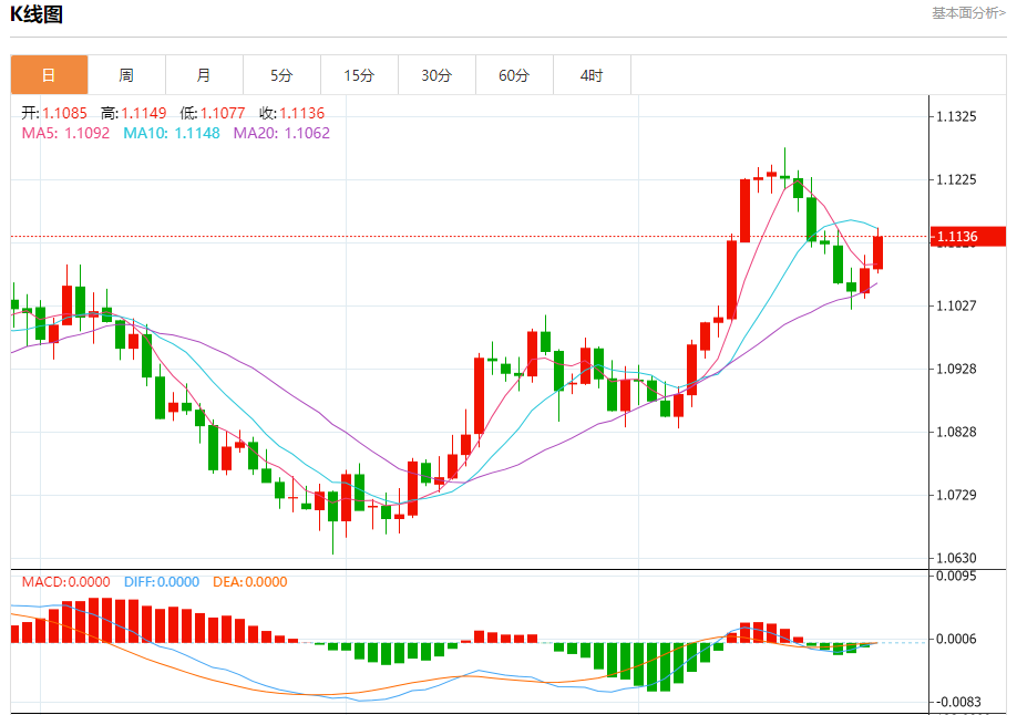 今日周四,截止目前欧元兑美元报1.1137,上涨0.46%。
