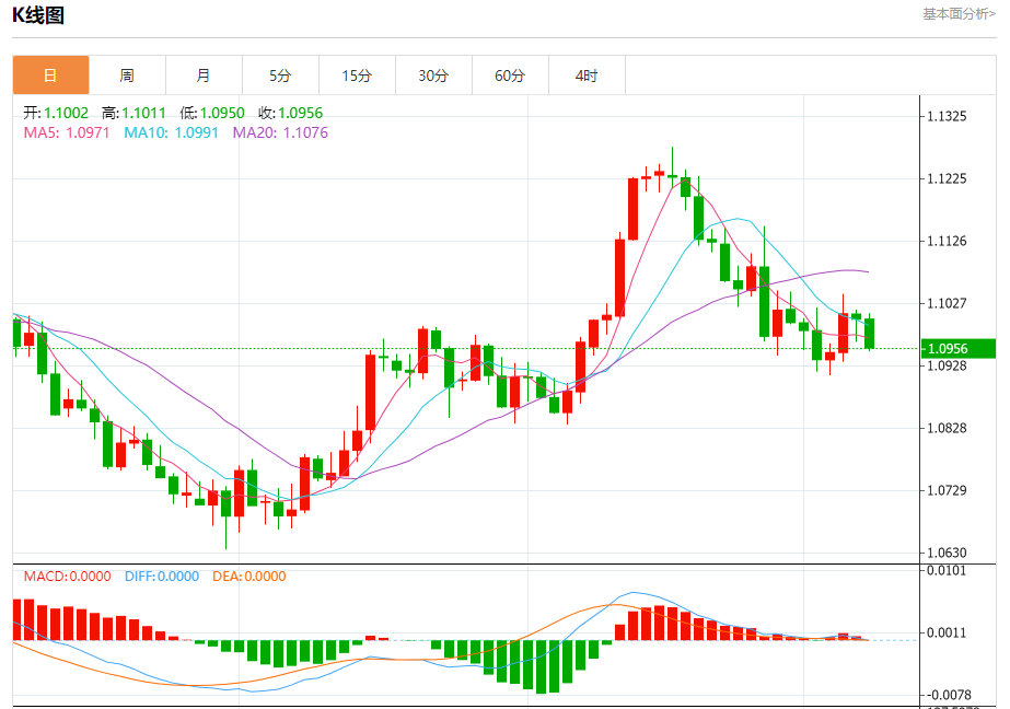 周二欧市盘中,欧元兑美元交投于1.0956,跌幅为0.42%。