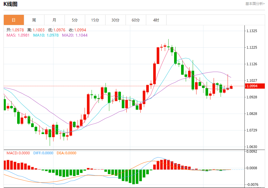 今日周五,截止目前欧元兑美元报1.0994,上涨0.12%。
