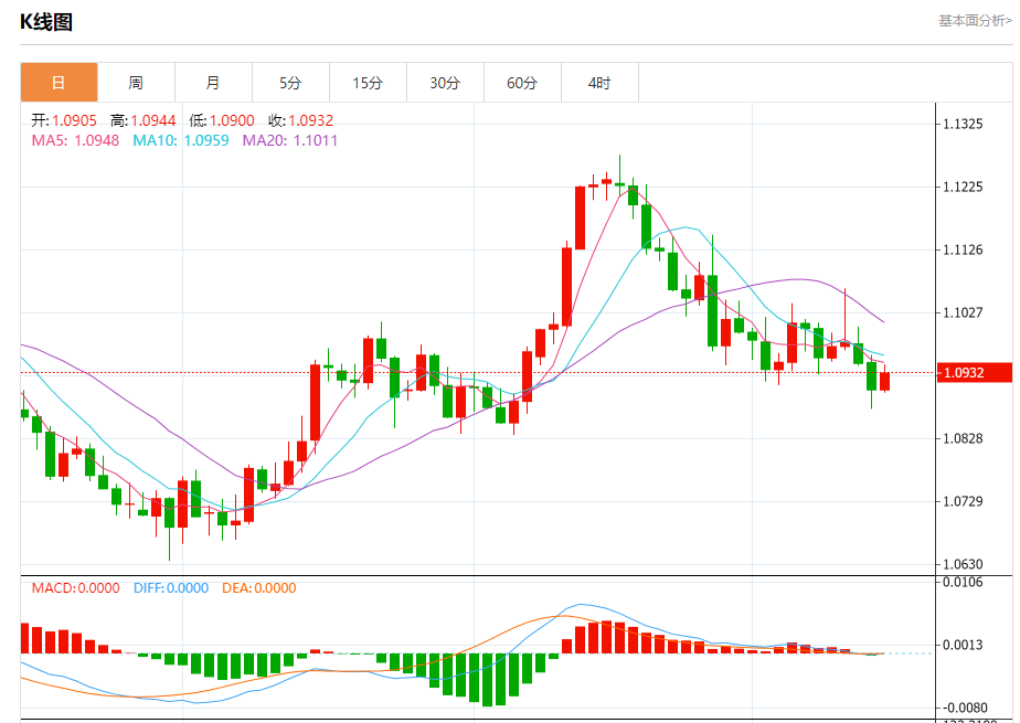 周二欧市盘中,欧元兑美元交投于1.0933,涨幅为0.25%。