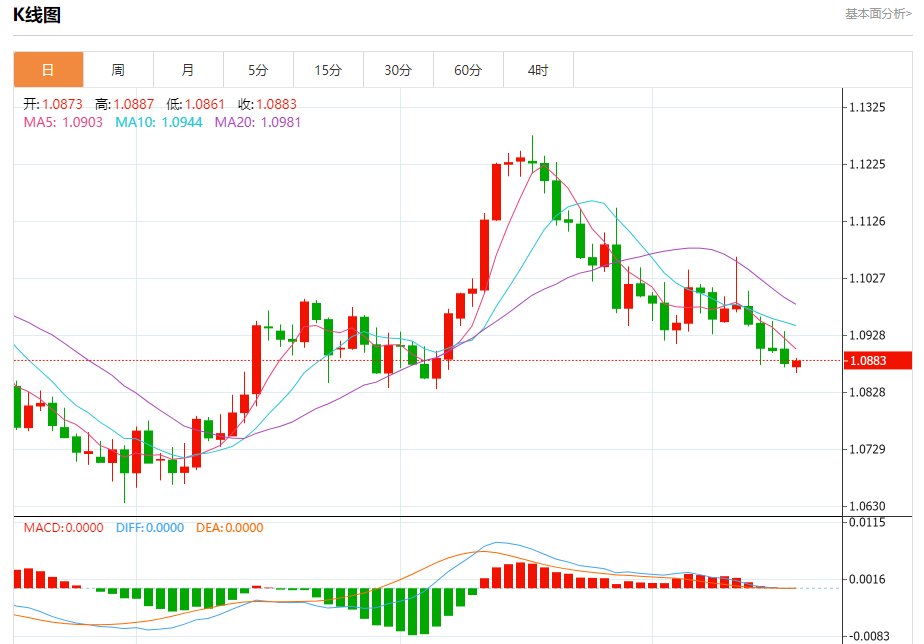 周四欧市盘中,欧元兑美元交投于1.0886,涨幅为0.07%。