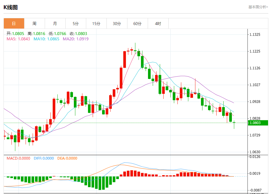周五欧市盘中,欧元兑美元交投于1.0805,跌幅为0.06%。