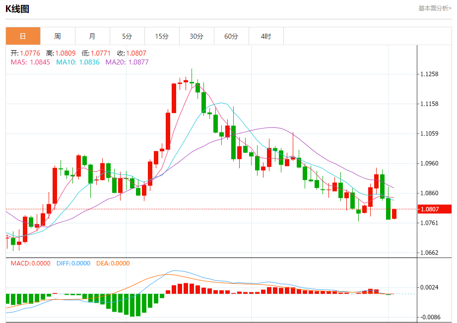 周一欧市盘中,欧元兑美元交投于1.0807,涨幅为0.30%。