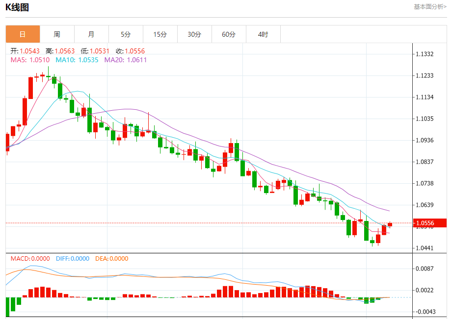 今日周五,截止目前欧元兑美元报1.0556,上涨0.08%。