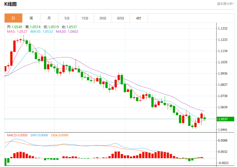 周一欧市盘中,欧元兑美元交投于1.0534,跌幅为0.47%。